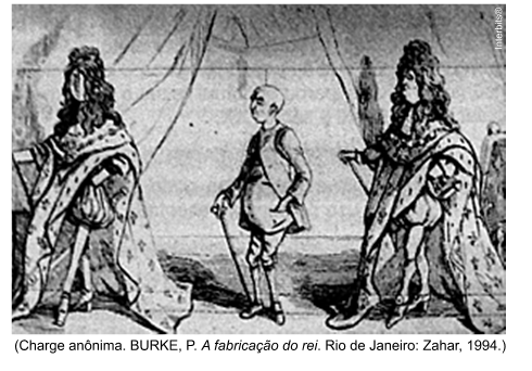 Na França, o rei Luís XIV teve sua imagem fabricada por um conjunto de estratégias que visavam sedimentar uma determinada noção de soberania. Neste sentido, a charge apresentada demonstra