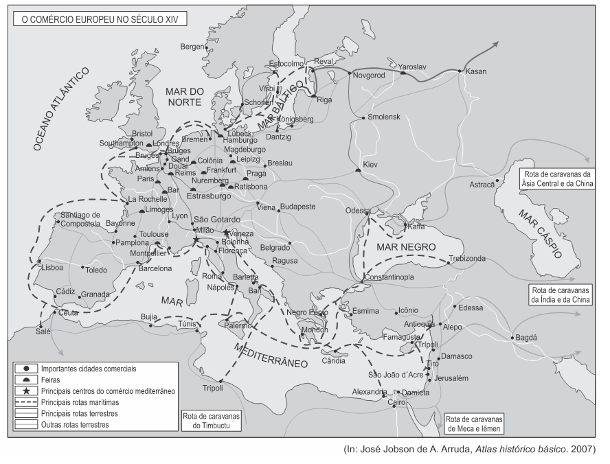 - e) As grandes rotas de comércio marítimo se concentravam no Mar do Norte e no Mediterrâneo, com mercadorias vindas inclusive do Oriente, como a seda.