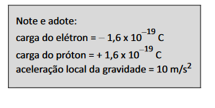 B (FUVEST 2015) Em uma aula de laboratório de Física, para estudar propriedades de cargas elétricas, foi realizado um experimento em que pequenas esferas eletrizadas são injetadas na parte superior de uma câmara, em vácuo, onde há um campo elétrico uniforme na mesma direção e sentido da aceleração local da gravidade. Observou-se que, com campo elétrico de módulo igual a 2 x 103 V/m, uma das esferas, de massa 3,2 x 10-15 kg, permanecia com velocidade constante no interior da câmara. Essa esfera tem