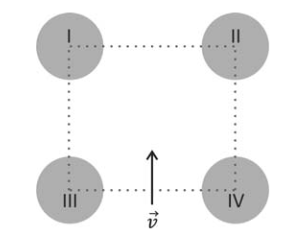 C (FUVEST 2016) Os centros de quatro esferas idênticas, I, II, III e IV, com distribuições uniformes de carga, formam um quadrado.Um feixe de elétrons penetra na região delimitada por esse quadrado, pelo ponto equidistante dos centros das esferas III e IV, com velocidade inicial v na direção perpendicular à reta que une os centros de III e IV, conforme representado na figura.