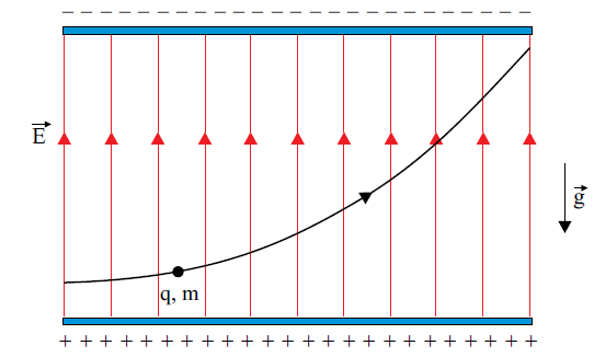 C (UNESP 2013) Uma carga elétrica q > 0 de massa m penetra em uma região entre duas grandes placas planas, paralelas e horizontais, eletrizadas com cargas de sinais opostos. Nessa região, a carga percorre a trajetória representada na figura, sujeita apenas ao campo elétrico uniforme E, representado por suas linhas de campo, e ao campo gravitacional terrestre g.