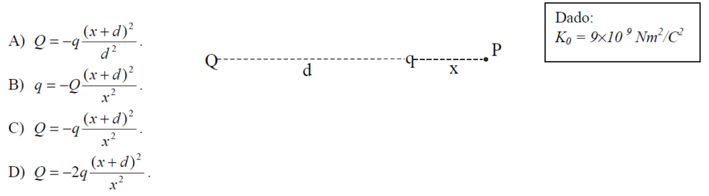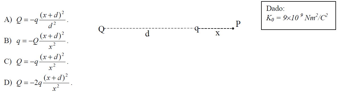 C (UNIMONTES 2011) Duas cargas puntiformes Q e q são separadas por uma distância d, no vácuo (veja figura). Se, no ponto P, o campo elétrico tem módulo nulo, a relação entre Q e q é igual a
