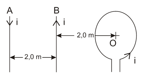 D (ESPCEX 2014) Dois fios “A” e “B” retos, paralelos e extensos, estão separados por uma distância de 2 m. Uma espira circular de raio igual a π/4 m encontra-se com seu centro “O” a uma distância de 2 m do fio “B”, conforme desenho abaixo.