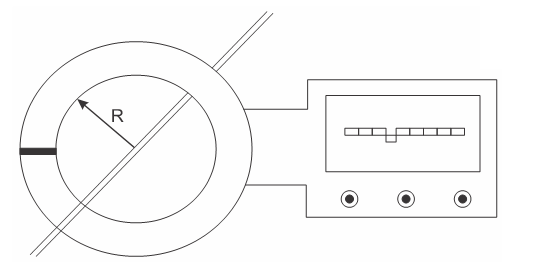 Um instrumento denominado amperímetro de alicate é capaz de medir a corrente elétrica em um ou mais condutores apenas os envolvendo com suas garras (ver figura). Quando essas são fechadas, o campo magnético produzido pelas correntes envolvidas pode ser medido por um sensor. Considere que dois condutores retilíneos, muito próximos um do outro atravessam o centro da área circular, de raio R, entre as garras do medidor. Sendo assim, o campo magnético medido pelo sensor será