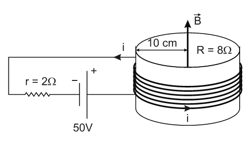 C (IFPE 2012) Uma bobina chata representa um conjunto de N espiras que estão justapostas, sendo essas espiras todas iguais e de mesmo raio. Considerando que a bobina da figura abaixo tem resistência de R = 8 Ω, possui 6 espiras, o raio mede 10 cm, e ela é alimentada por um gerador de resistência interna de 2 Ω e força eletromotriz de 50 V, a intensidade do vetor indução magnética no centro da bobina, no vácuo, vale: