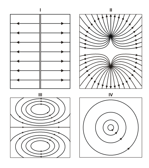 A (FUVEST 2012) Em uma aula de laboratório, os estudantes foram divididos em dois grupos. O grupo A fez experimentos com o objetivo de desenhar linhas de campo elétrico e magnético. Os desenhos feitos estão apresentados nas figuras I, II, III e IV abaixo.