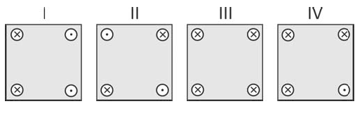B (UERN 2012) As figuras representam as seções transversais de 4 fios condutores retos, percorridos por corrente elétrica nos sentidos indicados, totalizando quatro situações diferentes: I, II, III e IV.