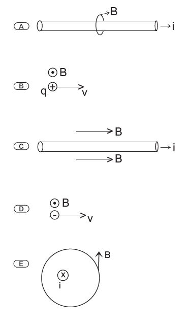 B (UFSM 2011) O campo magnético pode ser produzido pelo movimento de cargas elétricas ou, como ocorre nas ondas eletromagnéticas, pela variação do fluxo de campo elétrico local. Em qual das figuras a seguir está representado corretamente o campo magnético?