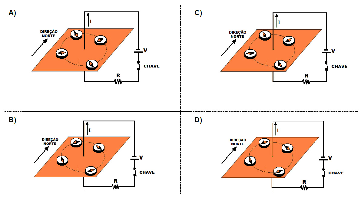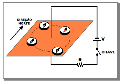 Inicialmente, com a chave desligada, as bússolas ficam orientadas exclusivamente pela ação do campo magnético terrestre. Ao ligar a chave e fazer circular uma corrente elétrica no circuito, esta irá produzir um campo magnético muito mais intenso que o terrestre. Com isso, as bússolas irão se orientar de acordo com as linhas desse novo campo magnético.
