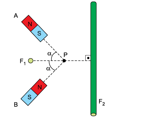 E (FCMSCSP 2019) Na figura estão representados, no plano dessa folha de papel, dois ímãs idênticos fixos, A e B, e um ponto P, equidistante dos ímãs. F1 e F2 são dois fios retilíneos dispostos ortogonalmente entre si, de modo que F1 é perpendicular ao plano que contém os ímãs e F2 está contido nesse plano. Inicialmente