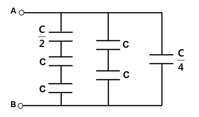 A (MACKENZIE 2018) Na associação de capacitores, esquematizada abaixo, a capacitância está indicada na figura para cada um dos capacitores. Assim, a capacitância equivalente, entre os pontos A e B no circuito, é