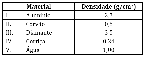 Ao serem adicionados pedaços de cada um desses materiais à água, observa-se a flutuação de