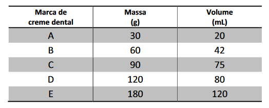(DENSIDADE) C (FUVEST 2015) Cinco cremes dentais de diferentes marcas têm os mesmos componentes em suas formulações, diferindo, apenas, na porcentagem de água contida em cada um. A tabela a seguir apresenta massas e respectivos volumes (medidos a 25° C) desses cremes dentais.