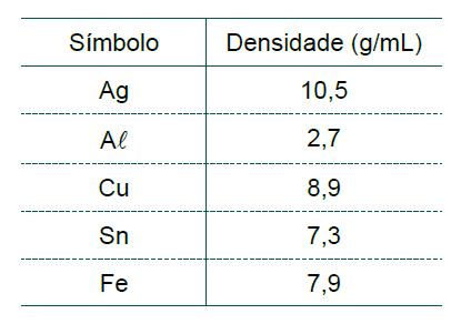 (DENSIDADE) B (FCMSCSP 2018) Certa cooperativa de reciclagem recebeu uma peça metálica maciça, da qual se sabe somente que é constituída de um elemento metálico de alta pureza. Os possíveis elementos e suas respectivas densidades estão apresentados na tabela.