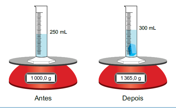 Para identificar o metal, um cooperado mergulhou a peça em uma proveta graduada com água, colocada sobre uma balança. A figura apresenta o nível da água e a massa total do conjunto, antes e depois da colocação da peça.