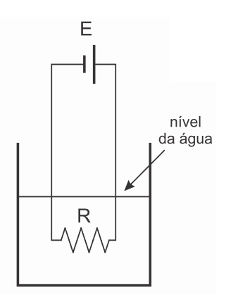 D (ESPCEX (AMAN) 2016) Num recipiente contendo 4,0 litros de água, a uma temperatura inicial de 20 °C, existe um resistor ôhmico, imerso na água, de resistência elétrica R =1 Ω, alimentado por um gerador ideal de força eletromotriz E= 50 V, conforme o desenho abaixo. O sistema encontra-se ao nível do mar. A transferência de calor para a água ocorre de forma homogênea. Considerando as perdas de calor desprezíveis para o meio, para o recipiente e para o restante do circuito elétrico, o tempo necessário para vaporizar 2,0 litros de água é