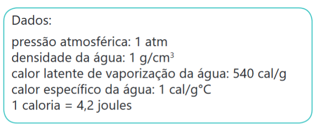 Adote: 1cal = 4,2 J; Calor específico da água = 1,0 cal/(g ∙ °C); Calor latente de vaporização da água = 540 cal/g; P = 1 atm.