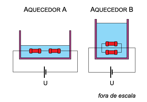 B (FCMSCSP 2019) Dois aquecedores elétricos, A e B, que contêm massas diferentes de água, mA e mB, à mesma temperatura inicial, foram montados com quatro resistores idênticos. No aquecedor A, dois desses resistores estão ligados em série. No aquecedor B, os outros dois resistores estão ligados em paralelo. Nos dois casos, os aparelhos são ligados à mesma diferença de potencial, U, constante.
