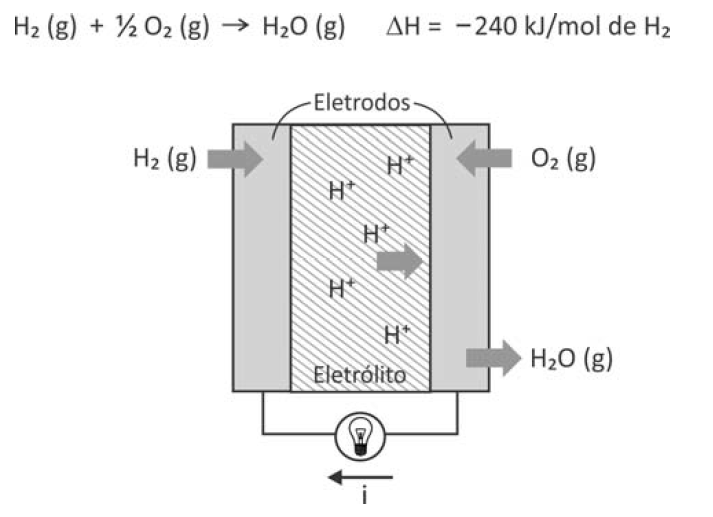 B (FUVEST 2017) Células a combustível são opções viáveis para gerar energia elétrica para motores e outros dispositivos. O esquema representa uma dessas células e as transformações que nela ocorrem.