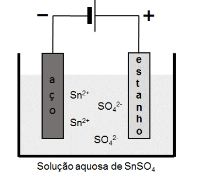 B (UNICAMP 2018) A galvanoplastia consiste em revestir um metal por outro a fim de protegê-lo contra a corrosão ou melhorar sua aparência. O estanho, por exemplo, é utilizado como revestimento do aço empregado em embalagens de alimentos. Na galvanoplastia, a espessura da camada pode ser controlada com a corrente elétrica e o tempo empregados. A figura abaixo é uma representação esquemática desse processo.