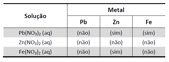 A (FUVEST 2017) Um estudante realizou um experimento para avaliar a reatividade dos metais Pb, Zn e Fe. Para isso, mergulhou, em separado, uma pequena placa de cada um desses metais em cada uma das soluções aquosas dos nitratos de chumbo, de zinco e de ferro. Com suas observações, elaborou a seguinte tabela, em que (sim) significa formação de sólido sobre a placa e (não) significa nenhuma evidência dessa formação: