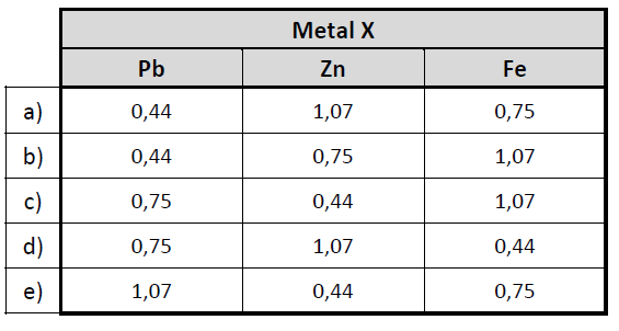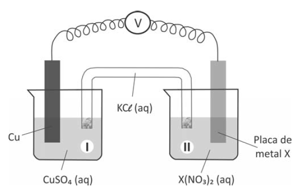 Em cada uma das três pilhas, o estudante utilizou, no béquer II, uma placa de um dos metais X (Pb, Zn ou Fe), mergulhada na solução aquosa de seu respectivo nitrato.