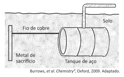 A (FUVEST 2018) Um método largamente aplicado para evitar a corrosão em estruturas de aço enterradas no solo, como tanques e dutos, é a proteção catódica com um metal de sacrifício. Esse método consiste em conectar a estrutura a ser protegida, por meio de um fio condutor, a uma barra de um metal diferente e mais facilmente oxidável, que, com o passar do tempo, vai sendo corroído até que seja necessária sua substituição.