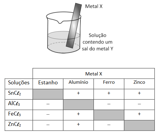 Um experimento para identificar quais metais podem ser utilizados como metal de sacrifício consiste na adição de um pedaço de metal a diferentes soluções contendo sais de outros metais, conforme ilustrado, e cujos resultados são mostrados na tabela. O símbolo ( + ) indica que foi observada uma reação química e o ( – ) indica que não se observou qualquer reação química.