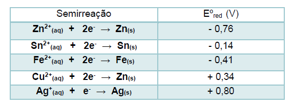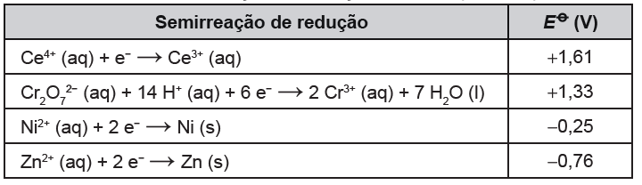 A (UFRGS 2016) O quadro abaixo relaciona algumas semirreações e seus respectivos potenciais padrão de redução, em solução aquosa.