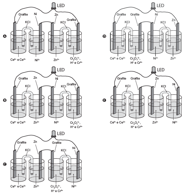 C (ENEM 2017) A invenção do LED azul, que permite a geração de outras cores para compor a luz branca, permitiu a construção de lâmpadas energeticamente mais eficientes e mais duráveis do que as incandescentes e fluorescentes. Em um experimento de laboratório, pretende-se associar duas pilhas em série para acender um LED azul que requer 3,6 volts para o seu funcionamento. Considere as semirreações de redução e seus respectivos potenciais mostrados no quadro.