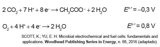 B (ENEM 2016) Em sistemas bioeletroquímicos, os potenciais padrão (E°’) apresentam valores característicos. Para as biocélulas de acetato, considere as seguintes semirreações de redução e seus respectivos potenciais: