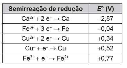 A (ENEM 2015) A calda bordalesa é uma alternativa empregada no combate a doenças que afetam folhas de plantas. Sua produção consiste na mistura de uma solução aquosa de sulfato de cobre(II), CuSO4, com óxido de cálcio, CaO, e sua aplicação só deve ser realizada se estiver levemente básica. A avaliação rudimentar da basicidade dessa solução é realizada pela adição de três gotas sobre uma faca de ferro limpa. Após três minutos, caso surja uma mancha avermelhada no local da aplicação, afirma-se que a calda bordalesa ainda não está com a basicidade necessária. O quadro apresenta os valores de potenciais padrão de redução (Eo) para algumas semirreações de redução.