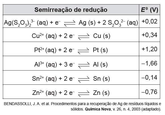 D (ENEM 2014) A revelação das chapas de raios X gera uma solução que contém íons prata na forma de Ag(S2O3)2-3 . Para evitar a descarga desse metal no ambiente, a recuperação de prata metálica pode ser feita tratando eletroquimicamente essa solução com uma espécie adequada. O quadro apresenta semirreações de redução de alguns íons metálicos.