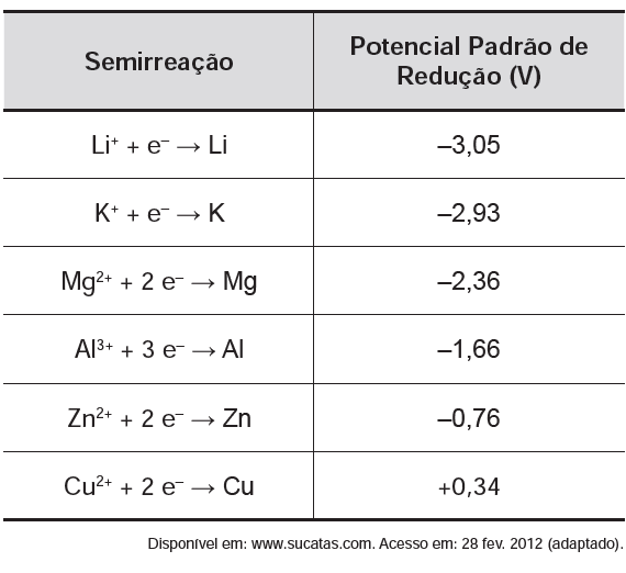 E (ENEM 2012) O boato de que os lacres das latas de alumínio teriam um alto valor comercial levou muitas pessoas a juntarem esse material na expectativa de ganhar dinheiro com sua venda. As empresas fabricantes de alumínio esclarecem que isso não passa de uma “lenda urbana”, pois ao retirar o anel da lata, dificulta-se a reciclagem do alumínio. Como a liga do qual é feito o anel contém alto teor de magnésio, se ele não estiver junto com a lata, fica mais fácil ocorrer a oxidação do alumínio no forno. A tabela apresenta as semirreações e os valores de potencial padrão de redução de alguns metais: