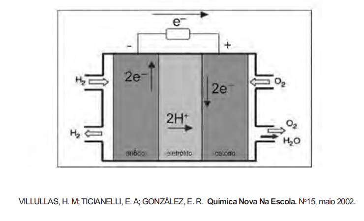 E (ENEM 2013) O Instituto Luiz Coimbra (UFRJ) lançou o primeiro ônibus urbano movido a hidrogênio do Hemisfério Sul, com tecnologia inteiramente nacional. Sua tração provém de três fontes de energia, sendo uma delas a pilha de combustível, na qual o hidrogênio, gerado por um processo eletroquímico, reage com o oxigênio do ar, formando água.