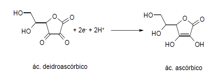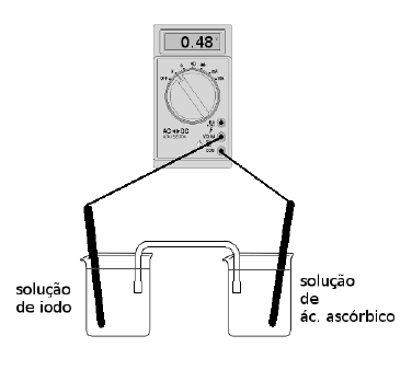 B (UFPR 2017) O ácido ascórbico é uma das formas da vitamina C que apresenta propriedade antioxidante. Na indústria de alimentos, ele é largamente utilizado como aditivo para prevenir a oxidação. Uma maneira de analisar a quantidade de ácido ascórbico em bebidas é através de uma reação de oxirredução utilizando iodo. Com base nisso, foi montada uma pilha, conforme ilustração ao lado, contendo eletrodos inertes de platina ligados a um voltímetro. Foram mantidas condições padrão (298 K, 1 atm e 1 mol L-1) para o experimento, e no instante em que se fechou o circuito, conectando-se os fios ao voltímetro, o valor de potencial medido foi de 0,48 V.