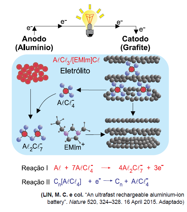 C (FGV SP 2018) Uma bateria de recarga ultrarrápida foi desenvolvida por pesquisadores da Universidade Stanford. Ela emprega eletrodos de alumínio e de grafite; e, como eletrólito, um sal