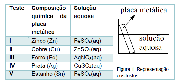 A (UPF 2018) Foram realizados testes mergulhando diferentes placas metálicas dentro de determinadas soluções aquosas (Figura 1), segundo os dados indicados no quadro a seguir.
