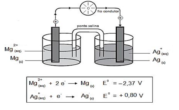 D (UPF 2017) A figura abaixo apresenta a representação de uma célula eletroquímica (pilha) e potenciais de redução das semirreações.
