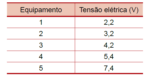 C (FCMSCSP 2019) A tabela indica a tensão elétrica mínima para colocar em funcionamento cinco diferentes equipamentos.