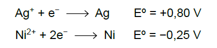 Uma bateria foi montada com quatro pilhas em série. Cada uma dessas pilhas consiste em um dispositivo com eletrodos de níquel e de prata em um meio eletrólito adequado. Os potenciais-padrão desses eletrodos estão indicados nas equações: