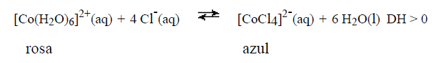 RESPOSTA: a) Quando ela é aquecida o equilíbrio é deslocado no sentido dos produtos, pois nesse sentido a reação é endotérmica. A coloração violeta vai se tornando mais azulada; b) Quando se adiciona mais ácido clorídrico, a concentração de Cl– aumenta (efeito do íon comum) e o equilíbrio é deslocado no sentido dos produtos, tornando a solução mais azulada.