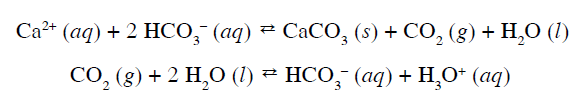 (EFEITO DO ÍON COMUM) (UFSCAR 2004) A água contendo íons como Ca2+, HCO3– e CO32-, em concentrações elevadas, é conhecida como água dura. A presença desses íons pode não ser prejudicial à saúde, mas torna a água imprópria para muitos usos domésticos e industriais. Para remoção do excesso de Ca2+, pode-se tratar a água dura em tanques de decantação, de acordo com os equilíbrios representados pelas equações: