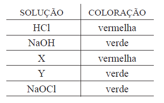 (HIDRÓLISE SALINA) (UNIFESP 2006) Extratos de muitas plantas são indicadores naturais ácido-base, isto é, apresentam colorações diferentes de acordo com o meio em que se encontram. Utilizando-se o extrato de repolho roxo como indicador, foram testadas soluções aquosas de HCl, NaOH, NaOCl, NaHCO3 e NH4Cl, de mesma concentração. Os resultados são apresentados na tabela