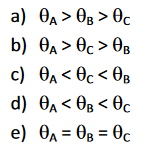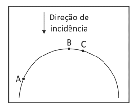 Os raios refletidos nos pontos A, B e C do espelho têm, respectivamente, ângulos de reflexão θA, θB, θC tais que