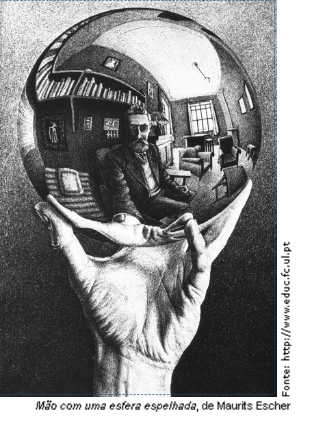 A (UFSM 2012)  A figura de Escher, “Mão com uma esfera espelhada”, apresentada a seguir, foi usada para revisar propriedades dos espelhos esféricos. Então, preencha as lacunas.