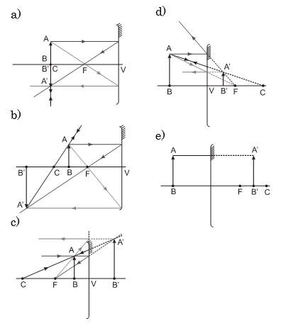 • d) ao se propagar em direção à superfície refletora de um espelho côncavo, paralelamente ao seu eixo principal, reflete-se passando pelo foco desse espelho.