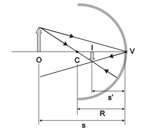C (PUC RJ 2011) Para o espelho côncavo esférico da figura, onde R = 10 cm, s = 30 cm, determine a distância s’ em cm da imagem ao vértice do espelho.