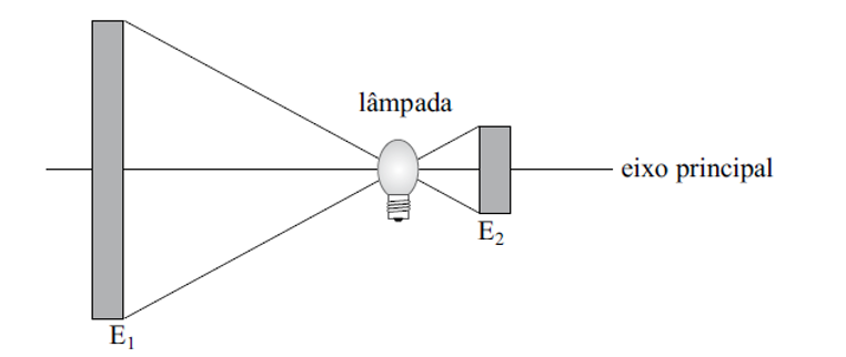 B (UEA 2012) Um holofote refletor é constituído por uma lâmpada incandescente e dois espelhos esféricos coaxiais dispostos frente a frente em suas superfícies refletoras. Um espelho (E1) refletirá a luz emitida pela lâmpada para frente com raios paralelos ao eixo principal. O outro espelho (E2) refletirá a luz da lâmpada sobre ela mesma.