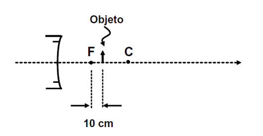 (UEM 2011) Um objeto real, direito, de 5 cm de altura, está localizado entre dois espelhos esféricos, um côncavo (R = 10 cm) e um convexo (R = 30 cm), sobre o eixo principal desses espelhos. O objeto está a uma distância de 30 cm do espelho convexo e de 10 cm do espelho côncavo.